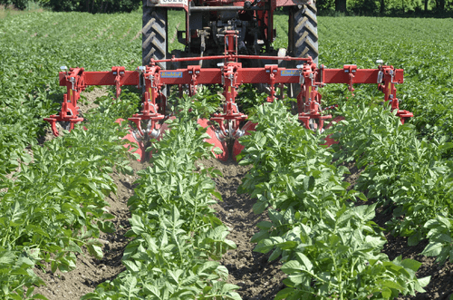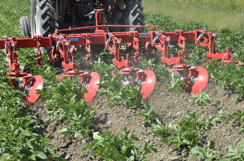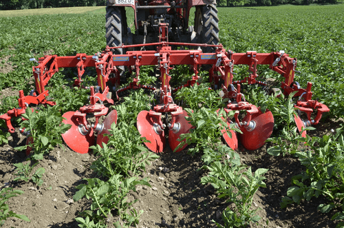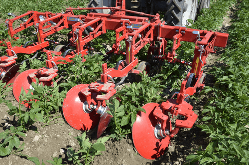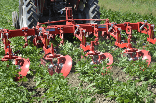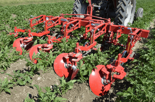 La bineuse HILLSTAR est un outil de buttage dont les dents à l'avant émiettent le sol et les grands disques butteur, montés en biais, remodèlent les buttes. Le grand diamètre de ces disques ménage la culture en place.