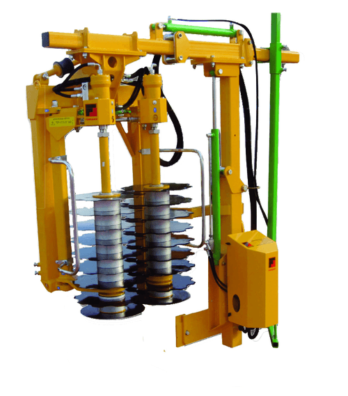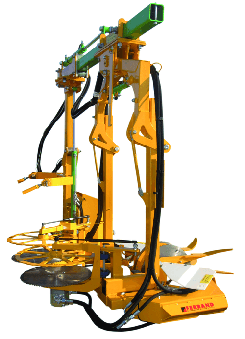 La pré-tailleuse Ferrand a pour équipement standard : mât polyvalent avec potence, commande électrique de la cabine, distributeur empilable évolutif, support tracteur et tirant, démontage rapide des disques, déport hydraulique.