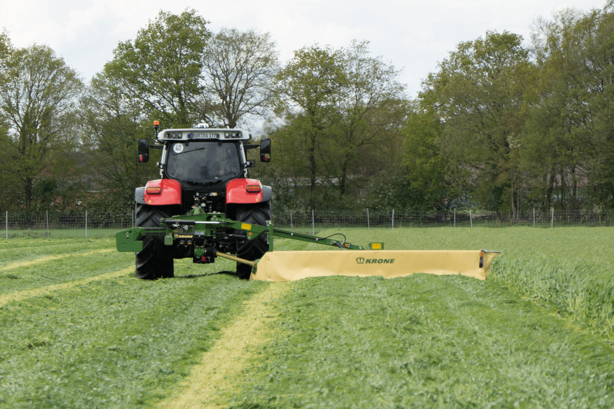 Faucheuse 4,50 m, équipée de série du système unique sur le marché de transfert de charge automatique EasyBalance pour compenser la grande largeur du lamier et ainsi soulager le tracteur. Suspension hydraulique réglable depuis la cabine, sécurité hydraulique non-stop permettant au lamier de se replier vers l'arrière et vers le haut en cas d'obstacle.