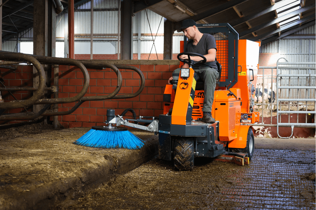 Moteur diesel Kubota 14cv, entrainement par les 2 roues arrière, dirigeable par la mono roue avant. Phare de travail, racleur relevable 1.2m placé sous le véhicule, cuve arrière de 900L avec convoyeur droite/gauche à vitesse variable. Brosse de balayage 850mm repliable. Disponible selon point de vente.