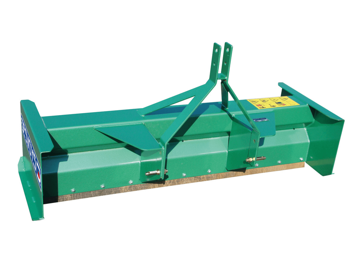 Rabot à lisier. Largeur : 2 m. Largeur hors-tout : 2.09 m. Attelage : catégorie 1 sur pitons diamètre 28. Lame racleuse caoutchouc réversible armé 65 shores, patins soudés. Côté : profondeur : 0,75 m, hauteur : 0.52 m, épaisseur : 6 mm. Poids : 185 kg.