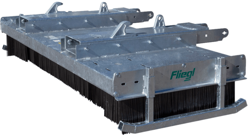 8 rangées de balais fixes + 2 frontaux et 1 central. Ski d'aide au réglage de chaque côté. Châssis galvanisé. Attelage EURO et fourche palette.