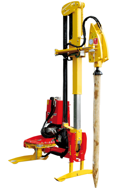 Enfonce les pieux de 0,60 à 3 m. Déport hydraulique, inclinaison de 30° et rotation (en option). Cloche de frappe robuste, forgée, usinée et traitée, Ø 150 mm (Ø 120 mm en option). Pointerolle à positionnement automatique. Contrôle par un simple boîtier de commande électrohydraulique.