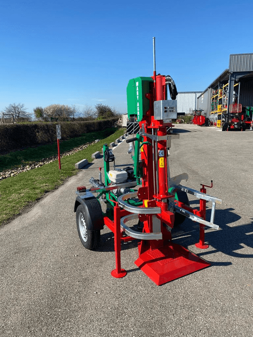 En version verticale, nous proposons une fendeuse de 14 tonnes de puissance de fendage, avec une course de vérin de 1100 mm et un passage de bûches de 1150 mm, Monté sur un châssis routier de qualité avec essieu Alko et roues 13.