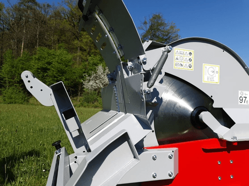 Scie circulaire à chevalet avec tapis monte bois. PDF tracteur 380 tr/min, tapis longueur 5 m, hauteur...
