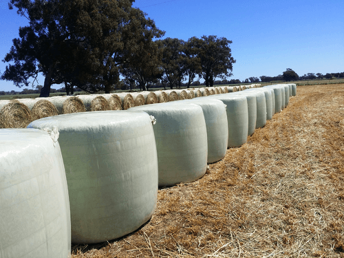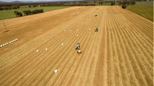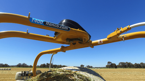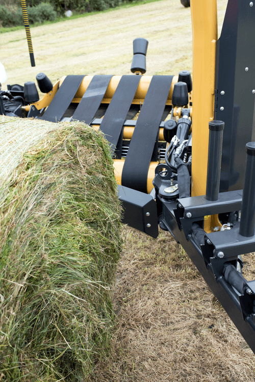 Enrubanneuse traînée double satellites, chargement dans le sens d'avancement de la presse. Table d'enrubannage fractionnée permettant un chargement et un déchargement simultanés de la balle. Ø de balle jusqu'à 1,5m et poids maxi 1 400kg.