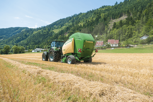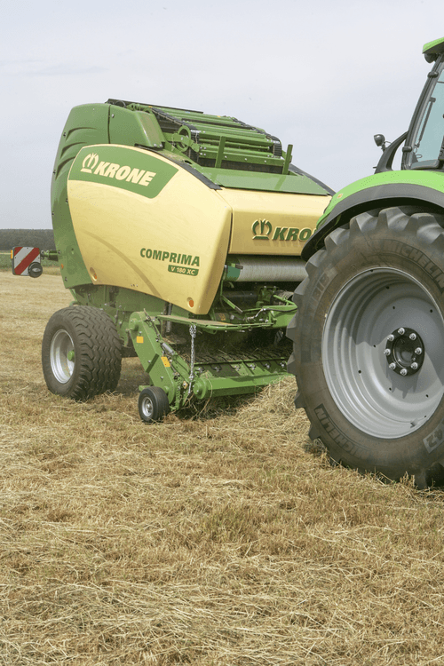 La presse Comprima V possède une chambre variable jusque 2,05 m de diamètre composée de deux tapis de pressage à sangles et barrettes. La sangle NOVOGRIP par KRONE est endurante et permet une formation de balle parfaite grâce à l'effet d'engrenage du fourrage.