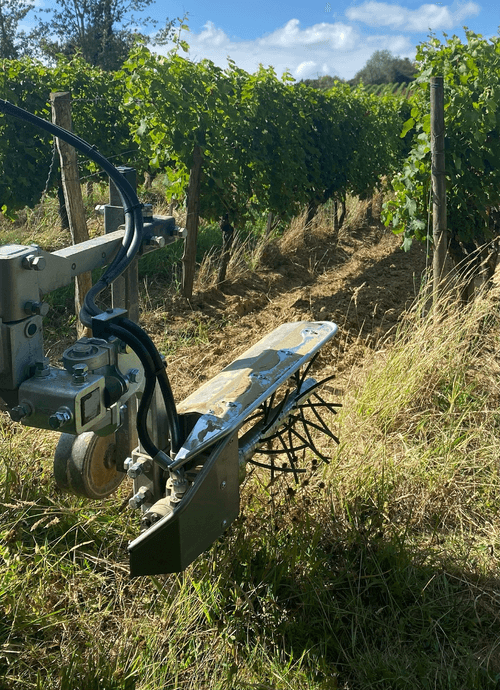 Cadre porte-outils polyvalent pour vignes de 1,30 à 3 m. Attelage 3 points frontal ou arrière. Différents équipements possibles : disques émotteurs et doigts, lames, tondeuses-épampreuse.