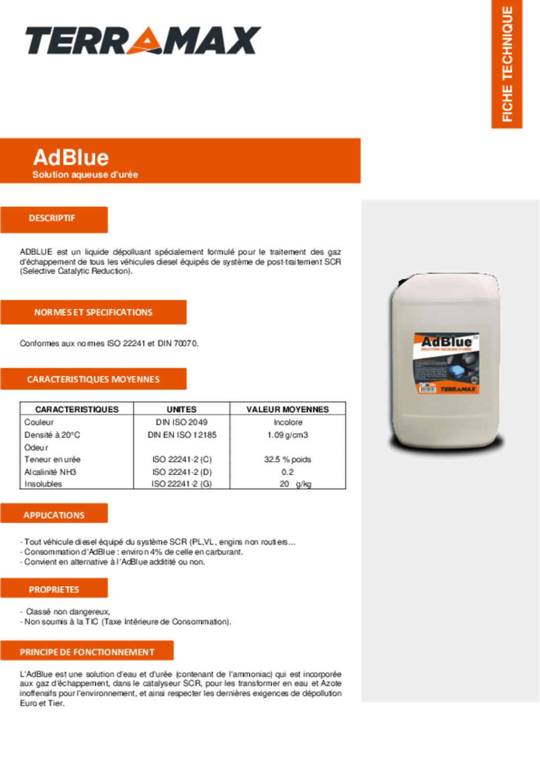 AdBlue. Solution d'eau et d'urée (contenant de l'ammoniac). Dépolluant gasoil pour tous les véhicules Diesel équipés de système de post-traitement SCR (Selective Catalytic Reduction). Fait l'objet de la dernière certification ISO 22241. Optimise la pulvérisation et évite la cristallisation et l'obstruction de système SCR. Conforme à la norme DIN 70070. Propriétés : réduction du taux d'émission des gaz polluants, amélioration des performances moteurs et diminution de la consommation de gazole. Bidon 25 L.