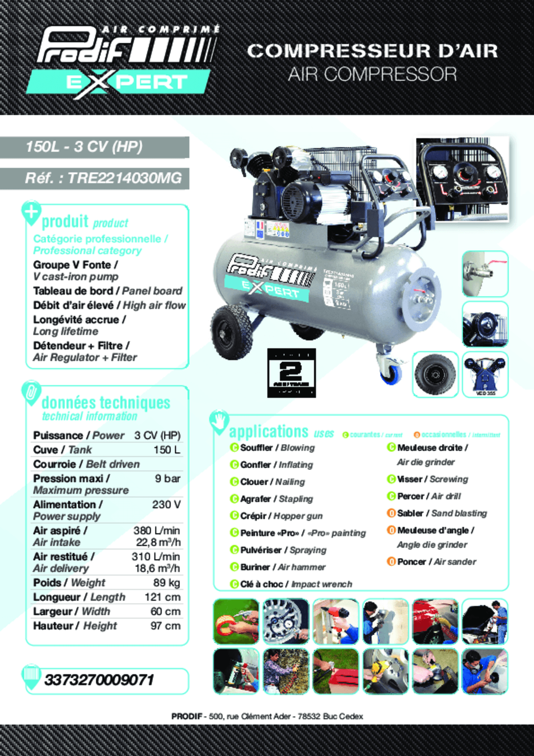 Débit aspiré : 380 L/min, débit restitué : 310 L/min, 9 Bar.