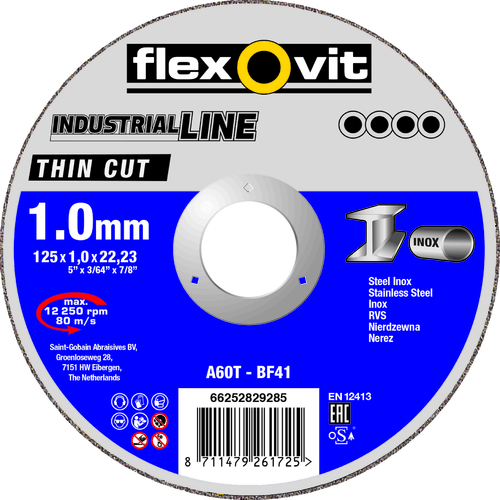 Disque à tronçonner. Moyeu plat. Acier/Inox. Formule sans soufre, ni fer, ni chlore. Applications universelles. Dimensions : 230x2x22,23 mm. Spécification : A 30 S-BF41.