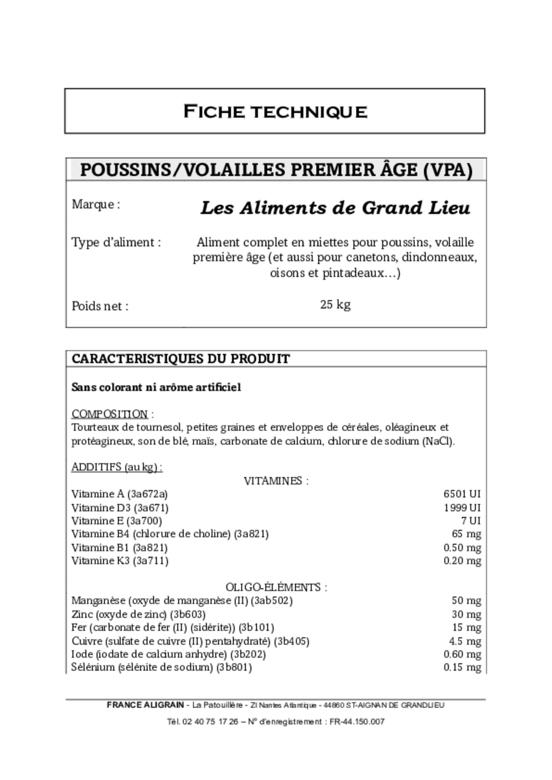 Aliment complet pour poules pondeuses. Composition : tourteaux d'extraction de tournesol, petites graines...