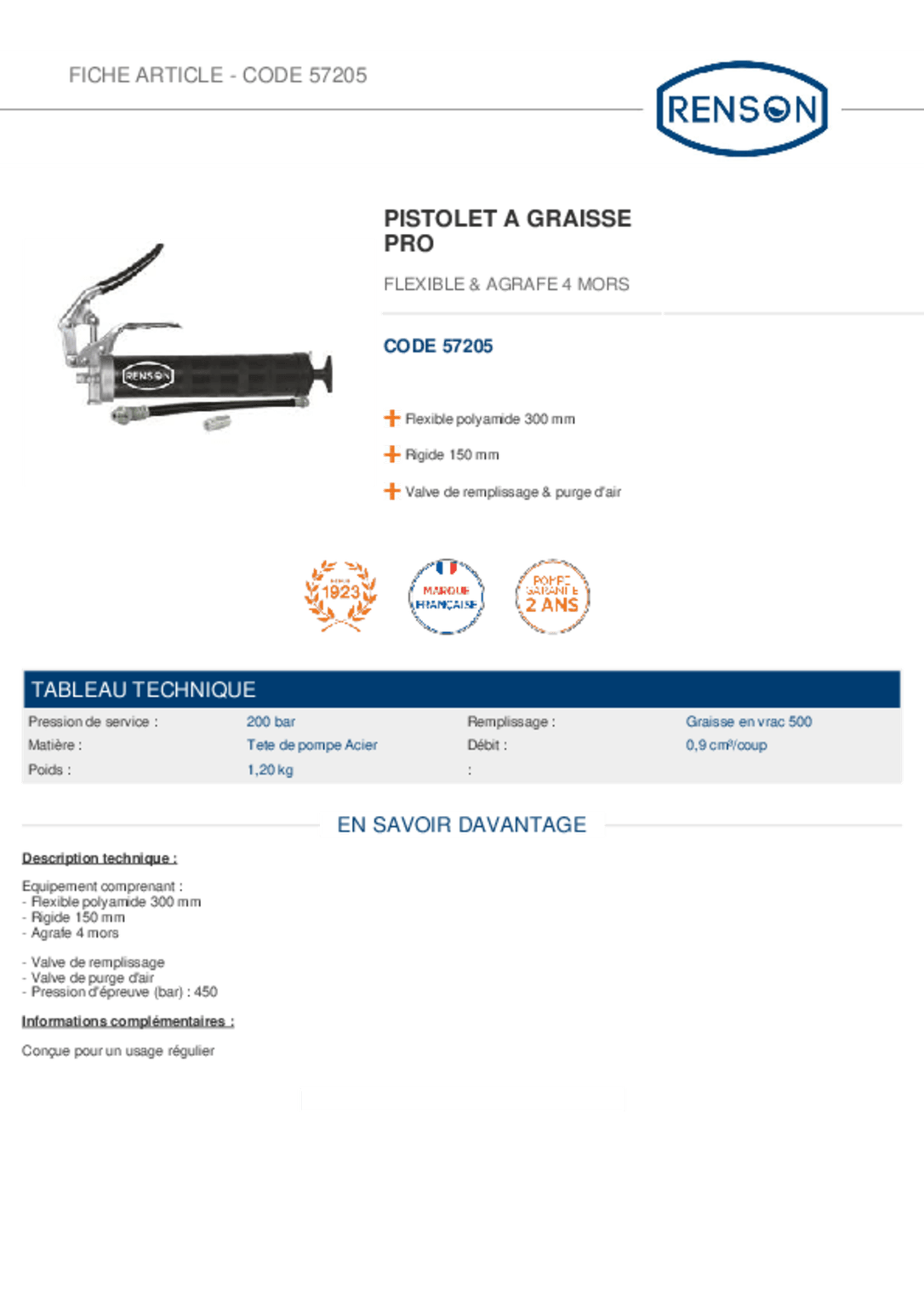 Pression de service : 200 Bar. Flexible polyamide 300 ml. Agrafe 4 mors.
