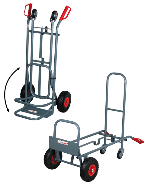 Transformable 2 positions : horizontale/verticale. En métal peint époxy. Pelle fixe 390 x 140 mm + rabattable 307 x 340 mm. 2 roues increvables et 2 roues pivotantes. Charge utile 250 kg.