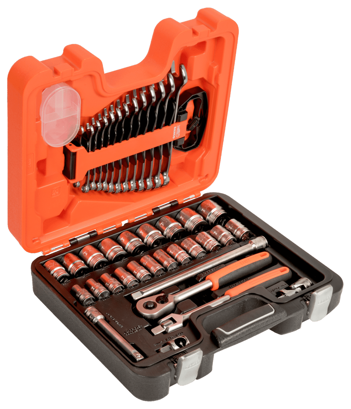 21 douilles 6 pans 1/2'' de 10 à 32 mm. 1 cliquet 1/2", 2 rallonges 1/2''. 1 cardan universel 1/2''. 1 adaptateur en T, 1/2''. 1 poignée articulée 1/2'' avec poignée bi-matière : 10"". 13 clés mixtes de 7 à 19 mm. 1 boîte plastique à 3 compartiments amovibles avec couvercle. Acier allié hautes performances. Moins d'usure et d'endommagement de la fixation grâce aux douilles à profil Dynamic-Drive™. Poignée en forme de U pour une prise en main confortable des clés. Bouton de dégagement rapide de douille sur le cliquet. Boîte : Polyéthylène haute densité (PEHD)
