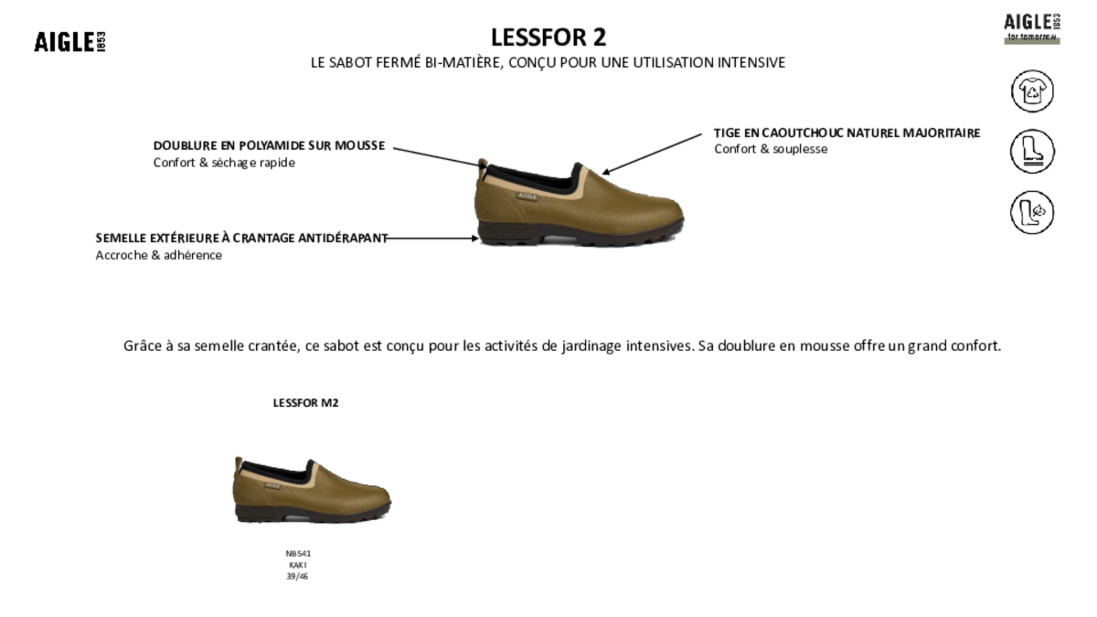 sabots fermés. Couleur kaki. Tige : caoutchouc. Semelle : caoutchouc, crantée renforcée d'un cambrillon....