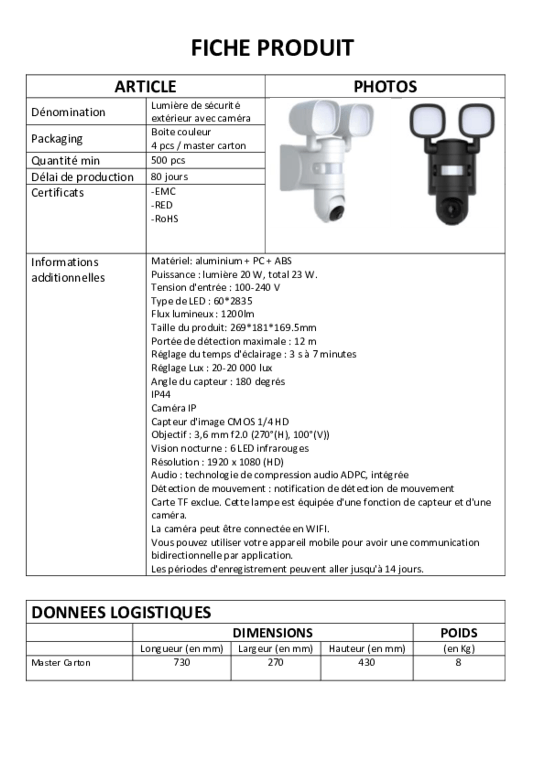 - Caméra de surveillance avec éclairage extérieur