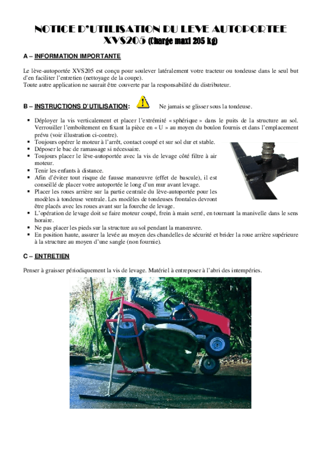 Capacité de levage : 300 kg et angle maxi de 42°.