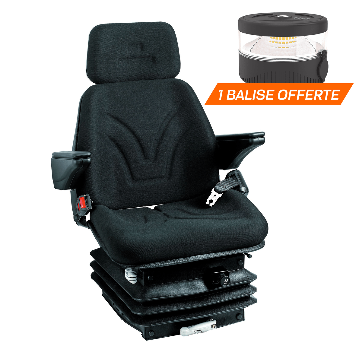 Suspension conforme aux dernières normes et homologations Européennes CEE 78/764CLASSE A-III. Compresseur 12 V intégré dans la pension pneumatique. Homologué pour machines TP selon les normes ISO7096 EM1-EM3. Pièces de rechange assurées. Pour tout tracteur supérieur à 80 ch. Réglage : poids : 50-120 kg, dossier 0°-15°, hauteur : 60 mm. Tissu noir.