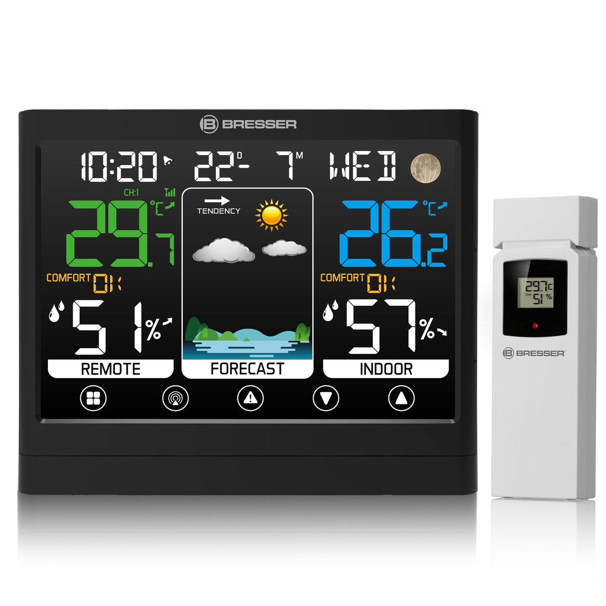 Station météo avec écran couleur et écran tactile. Prévisions météo par icone avec tendance. Température et humidité intérieure et extérieure avec tendance. Horloge radio-pilotée. Indicateur de confort. Indice de chaleur et point de rosée. Alarme de température et d’humidité. Mémoire de valeur max/min. Réglage automatique de l’heure et de la date (DCF). Portée du capteur extérieur : jusqu’à 80 m. Réveil avec fonction snooze. 3 canaux pour capteurs sans fil.
