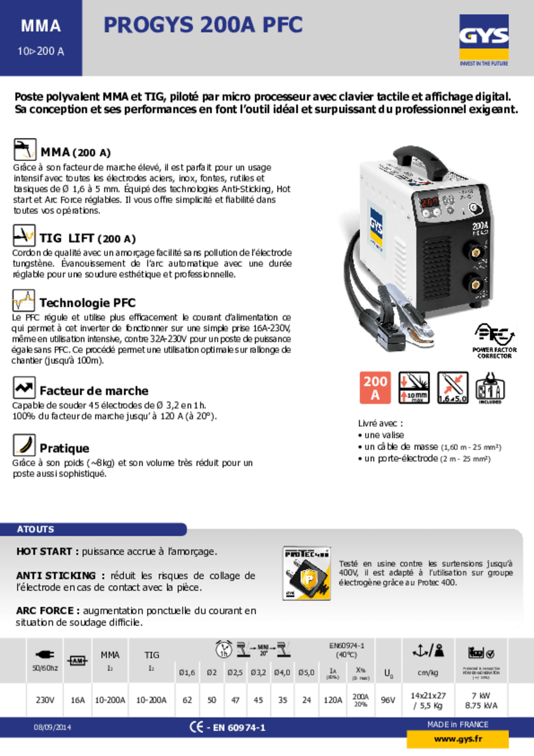 230 V - 16 A. Soudures sur acier, fonte et inox. Soudures TIG lift (DC). Pour électrodes de diamètre 1,6 à 5 mm. Livré en valise avec accessoires.