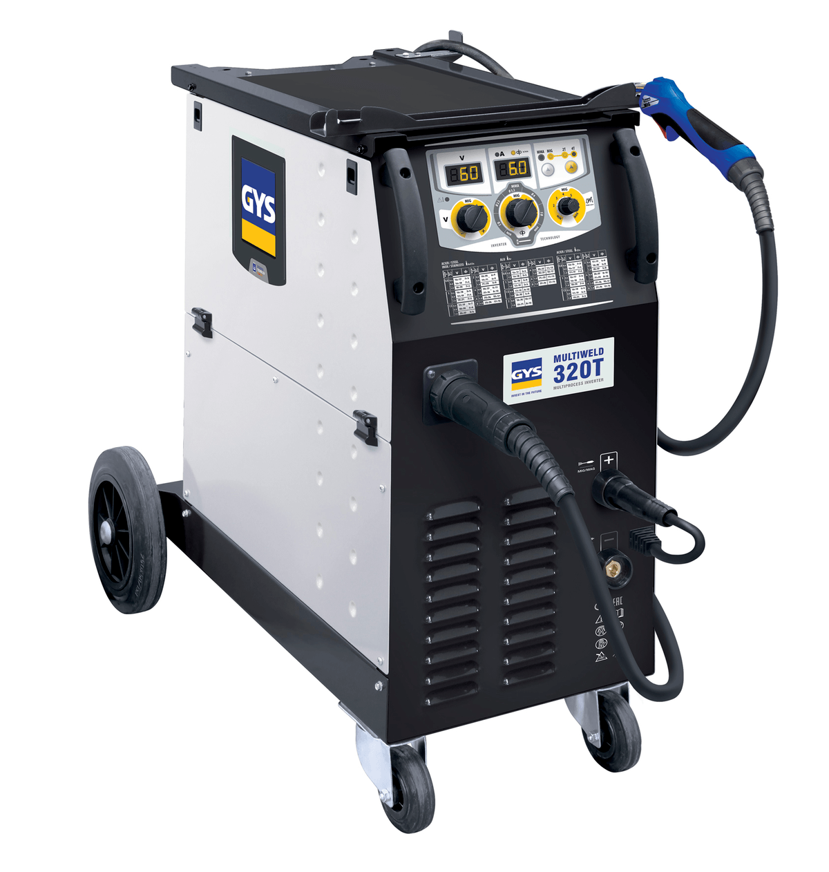 Poste de soudure inverter semi-automatique MIG/MAG 320 A: générateur triphasé combinant les procédés de soudage MIG/MAG, fil fourré et MMA. Équipé d’un système de dévidage précis et puissant à 4 galets, permet de souder sans difficulté le fil Ø 1.2 mm. Livré avec torche MIG36, raccord européen (4 m) et pince de masse (4 m / 35 mm²)